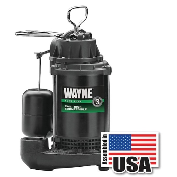 1/3 hp cast iron and coated steel submersible sump pump. Assembled in the US with foreign and domestic parts. Float switch tested to 1 million cycles. Top suction pump design eliminates air locks and clogging from debris in bottom of sump pit. Epoxy-coated steel motor housing and rugged, cast iron pump base. Fully submersible. 1/3 hp, max flow rate is 3800 gph at 0 ft 1-1/2 in. NPT discharge. For use in 11 in. diameter or larger sump basins, 9 in ON level and 4 in OFF level.