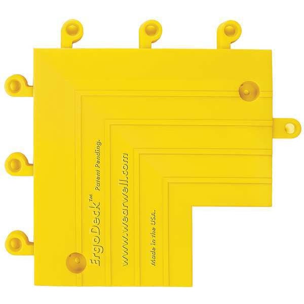 Ramp Inside Corner, Anti-Slip Backing Yes, Anti-Slip Surface Yes, Antifatigue Material No, DOC FF1-70 Rating Yes, NFSI High Traction Certified Yes, Recycled Content 80 Percent, NSF/ANSI 52 No, Antimicrobial No, Autoclavable No, Backing Characteristics Solid with Ridges, Surface Texture Raised Pattern, USDA Certified No, X-Ray Detectable No, Washdown Safe Yes, Color Yellow, Connection Style Peg and Hole, Edge Gender Female, Edge Style Beveled, Length 9 in, Material PVC