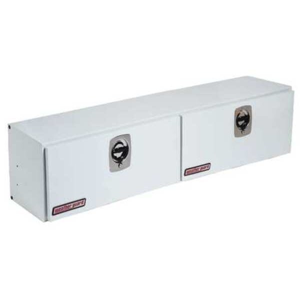Topside Truck Box, White, Double Drop-Down Doors, Overall Width 72 1/4 in, Overall Depth 13 1/2 in, Overall Height 16 in, Storage Capacity 8.9 cu ft, 14 ga Gauge, Mounting Style Bolt-On and Clamp-On, Locking System Keyed with Drill-Resistant Lock Core, Latch Mechanism D-Handle, 3-Point, Includes (2) Keys, Body Material Steel, Cover Material Aluminum, Lid Type Adjustable, Features Rain Gutter and Full Weather Seal, Removable Parts Bin, Lid Hinge Yes, Weather Resistant Yes