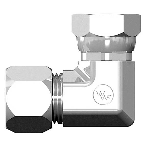Compression Fitting Elbow, Application Hydraulics, Fitting Side A Connection Type Compression, Fitting Side B Connection Type FJIC, Finish/Coating Zinc Trivalent, Fitting Material Steel, Fitting Side A Tube Outer Diameter 3/8 in, Material Grade 1045, 12L14, Maximum Operating Pressure 5,000 psi, Maximum Operating Temperature 450 Degrees F, Overall Length 1 1/16 in, Specific Fitting Shape 90 Degrees Swivel Elbow Adapter, Fitting Side B Pipe Size 9/16 in