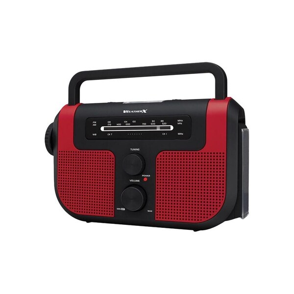 A powerful LED flashlight provides lighting for any occasion. An AM/FM/weather band radio keeps you informed of the latest weather alerts and local AM and FM programs. A dynamo hand crank, solar charging panel, and DC battery power ensure you're ready for any situation.