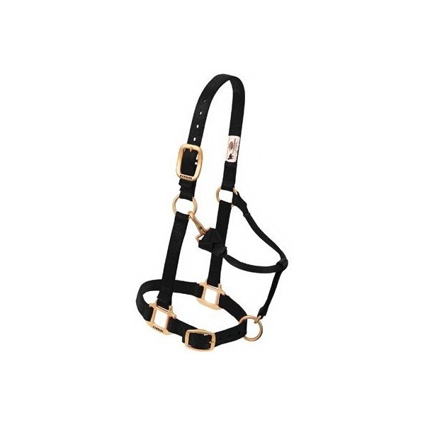 34, Black, WeanlingPony, Original Adjustable Chin Throat Snap Halter, Top Quality Nylon Construction, Heat Sealed Oblong Buckle Holes, Box Stitching At Stress Points True To Fit Sizing, Features A Convenient, Adjustable Design, A Flat Throat Brass Plated Hardware, Except LoopedOn Throat Snap Is NonRust Solid Brass