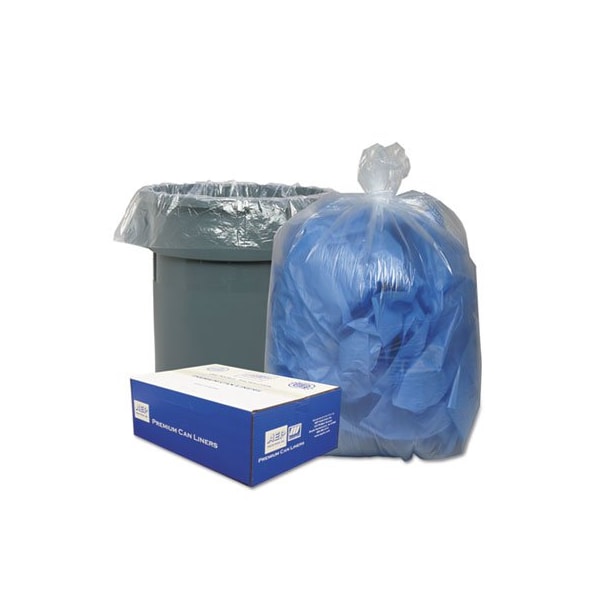 Low density resin blends improve bag strength and elasticity to resist punctures. Ideal for indoor or outdoor receptacles containing heavy, wet trash. Clear liners allow contents to show to deter pilferage and are great for recycling. Star-sealed bottom construction distributes weight more evenly and resists leaks. Coreless rolls for convenient dispensing. Application: Can Liner; Capacity Range Volume Max: 56 gal; Thickness: 0.9 mil; Grade: Heavy-Duty.