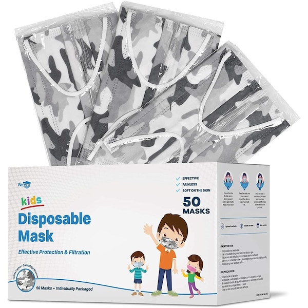 Kids Disposable Face Mask, 3, Camo White, Kids, 50 PK