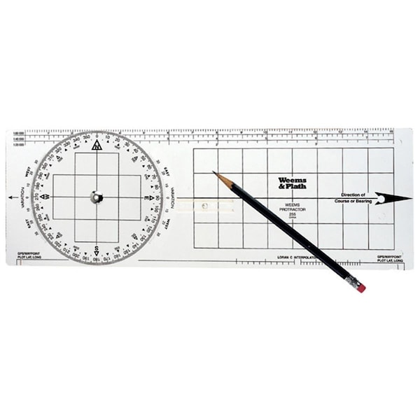 This navigation tool is versatile and can be used to lay off a course or a bearing measure distance between any two points plot a position on a chart from a given set of coordinates or determine the coordinates of a position on a chart. It is an updated version of the Breton and Portland Plotters. Pencil and sharpener included. Dims: 15in x 5in.