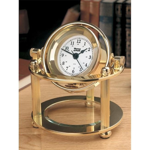 Polished brass and lacquered gimbaled quartz clock swivels for any viewing angle and can be locked in place. Stands on three brass legs. Beveled glass crystal below clock can be etched for personalization. Brass plate for engraving and an N battery included. Dims: 4.624" x 5.25" x 5.25".
