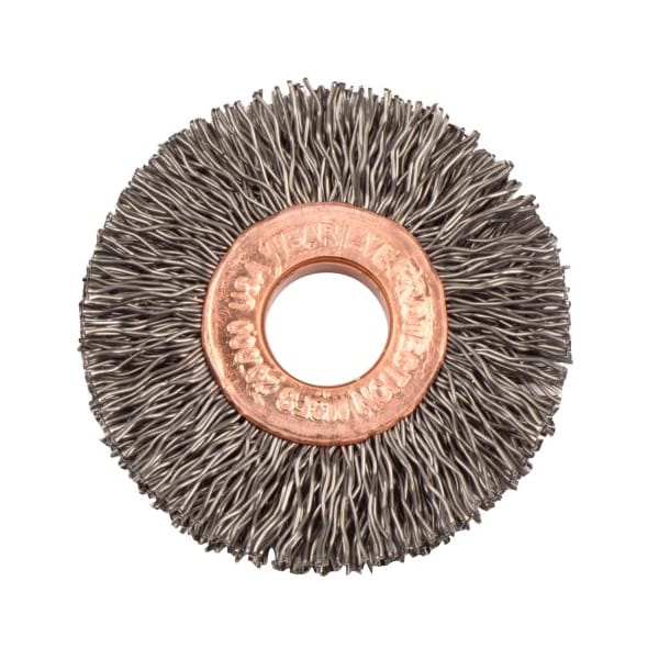 Weiler 1-1/2" Small Diameter Crimped Wire Wheel Brush provides a flexible brushing action and consistent performance for demanding light duty cleaning and deburring applications. Featuring Weiler's solid ring construction, these radial brushes are available in heat-treated steel, type 302 stainless steel and brass wire for use in a wide variety of applications. 3/8" arbor hole for use on die grinder, right angle die grinder and drills. Provides a flexible brushing action and consistent performance for demanding light duty cleaning and deburring applications. For use on straight grinders and stationary machines such as bench or pedestal grinders and buffing lathes. Weiler's small diameter crimped wire wheels feature a plain arbor hole for use on a variety of portable tools and stationary machines. Featuring Weiler's solid ring construction, these radial brushes are available in heat-treated steel, type 302 stainless steel and brass wire for use in a wide variety of applications. .