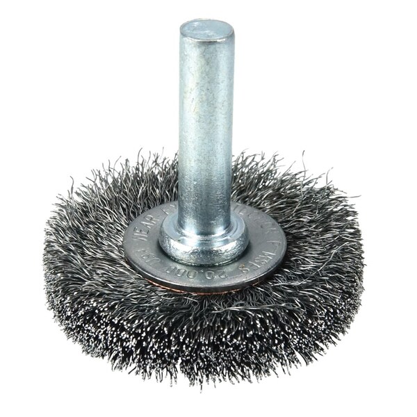Weiler 1-1/2" Stem-Mounted Crimped Wire Radial Wheel provides a flexible brushing action and consistent performance for demanding light-duty cleaning and deburring applications on steel. Side plates for a shorter trim length and more controlled brushing action. The permanently-attached 1/4 in stem are primarily intended for use on high speed die grinders. Although they can also be mounted onto a drill, the speed and power of that tool will decrease effectiveness of the brush. Featuring Weiler's solid ring construction, these radial wheels are available in heat-treated steel, type 302 stainless steel and brass wire. Side plates for a shorter trim length and more controlled brushing action in a stem-mounted crimped wire wheel. Crimped wire wheels with a permanently-attached 1/4 in stem or shank are primarily intended for use on high speed die grinders. Although they can also be mounted onto a drill, the speed and power of that tool will light weight the effectiveness of the brush. Featuring Weiler's solid ring construction, these radial wheels are available in heat-treated steel, type 302 stainless steel and brass wire. .