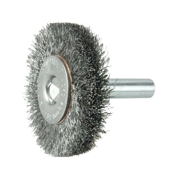 Weiler 1-1/2" Stem-Mounted Crimped Wire Radial Wheel provides a flexible brushing action and consistent performance for demanding light-duty cleaning and deburring applications on steel. Side plates for a shorter trim length and more controlled brushing action. The permanently-attached 1/4 in stem are primarily intended for use on high speed die grinders. Although they can also be mounted onto a drill, the speed and power of that tool will decrease effectiveness of the brush. Featuring Weiler's solid ring construction, these radial wheels are available in heat-treated steel, type 302 stainless steel and brass wire. Side plates for a shorter trim length and more controlled brushing action in a stem-mounted crimped wire wheel. Crimped wire wheels with a permanently-attached 1/4 in stem or shank are primarily intended for use on high speed die grinders. Although they can also be mounted onto a drill, the speed and power of that tool will light weight the effectiveness of the brush. Featuring Weiler's solid ring construction, these radial wheels are available in heat-treated steel, type 302 stainless steel and brass wire. .