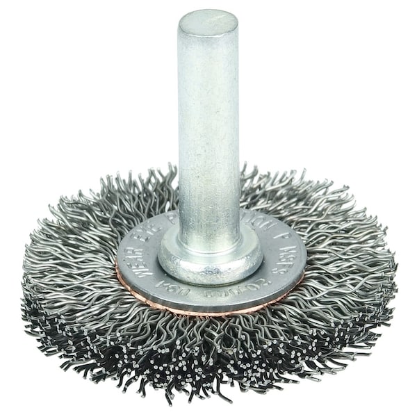 Weiler 1-1/2" Stem-Mounted Crimped Wire Radial Wheel provides a flexible brushing action and consistent performance for demanding light-duty cleaning and deburring applications on stainless steel. Side plates for a shorter trim length and more controlled brushing action. The permanently-attached 1/4 in stem are primarily intended for use on high speed die grinders. Although they can also be mounted onto a drill, the speed and power of that tool will decrease effectiveness of the brush. Featuring Weiler's solid ring construction, these radial wheels are available in heat-treated steel, type 302 stainless steel and brass wire. Side plates for a shorter trim length and more controlled brushing action in a stem-mounted crimped wire wheel. Crimped wire wheels with a permanently-attached 1/4 in stem or shank are primarily intended for use on high speed die grinders. Although they can also be mounted onto a drill, the speed and power of that tool will light weight the effectiveness of the brush. Featuring Weiler's solid ring construction, these radial wheels are available in heat-treated steel, type 302 stainless steel and brass wire. .