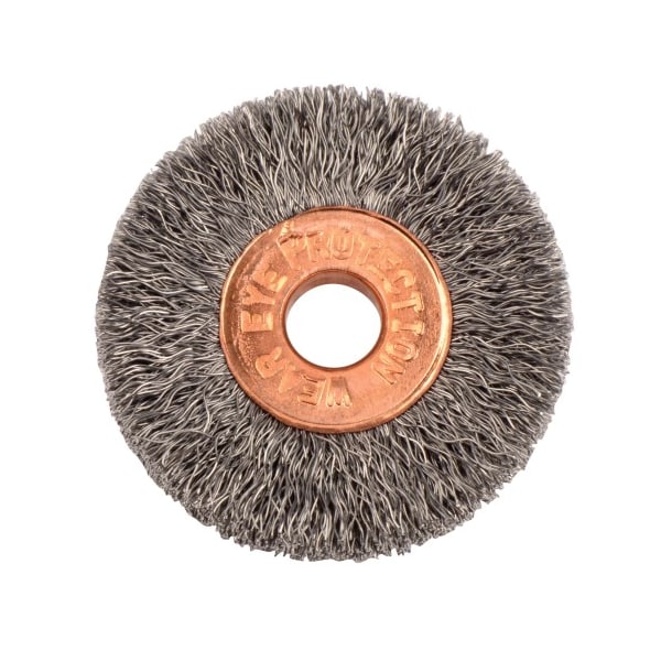 Weiler 1-1/4" Small Diameter Crimped Wire Wheel Brush provides a flexible brushing action and consistent performance for demanding light duty cleaning and deburring applications. Featuring Weiler's solid ring construction, these radial brushes are available in heat-treated steel, type 302 stainless steel and brass wire for use in a wide variety of applications. 1/4" arbor hole for use on die grinder, right angle die grinder and drills. Provides a flexible brushing action and consistent performance for demanding light duty cleaning and deburring applications. For use on straight grinders and stationary machines such as bench or pedestal grinders and buffing lathes. Weiler's small diameter crimped wire wheels feature a plain arbor hole for use on a variety of portable tools and stationary machines. Featuring Weiler's solid ring construction, these radial brushes are available in heat-treated steel, type 302 stainless steel and brass wire for use in a wide variety of applications. .