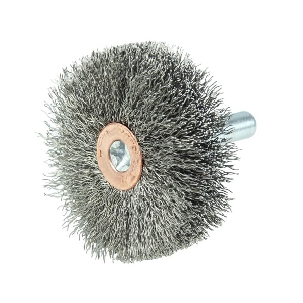 Weiler 1-3/4" Wide Face Stem-Mounted Crimped Wire Wheel provides a flexible brushing action and consistent performance for demanding light-duty cleaning and deburring applications on stainless steel. The permanently-attached 1/4 in stem are primarily intended for use on high speed die grinders. Although they can also be mounted onto a drill, the speed and power of that tool will decrease the effectiveness of the brush. Featuring Weiler's solid ring construction, these radial wheels are available in heat-treated steel, type 302 stainless steel and brass wire. Provides a flexible brushing action and consistent performance for demanding light duty cleaning and deburring applications. Crimped wire wheels with a permanently-attached 1/4 in stem or shank are primarily intended for use on high speed die grinders. Although they can also be mounted onto a drill, the speed and power of that tool will light weight the effectiveness of the brush. Featuring Weiler's solid ring construction, these radial wheels are available in heat-treated steel, type 302 stainless steel and brass wire. .