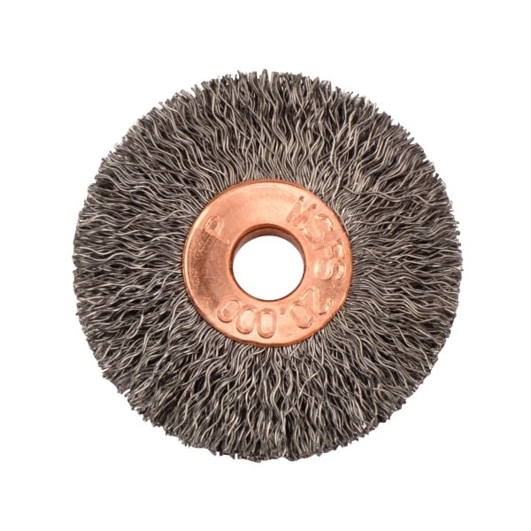 Weiler 1-3/8" Small Diameter Crimped Wire Wheel Brush provides a flexible brushing action and consistent performance for demanding light duty cleaning and deburring applications. Featuring Weiler's solid ring construction, these radial brushes are available in heat-treated steel, type 302 stainless steel and brass wire for use in a wide variety of applications. 1/4" arbor hole for use on die grinder, right angle die grinder and drills. Provides a flexible brushing action and consistent performance for demanding light duty cleaning and deburring applications. For use on straight grinders and stationary machines such as bench or pedestal grinders and buffing lathes. Weiler's small diameter crimped wire wheels feature a plain arbor hole for use on a variety of portable tools and stationary machines. Featuring Weiler's solid ring construction, these radial brushes are available in heat-treated steel, type 302 stainless steel and brass wire for use in a wide variety of applications. .