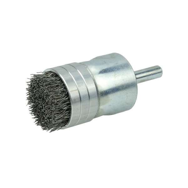 Weiler 1" Banded Crimped Wire End Brush features a pair of bands around the fill to reduce the exposed trim length and light weight brush flaring at operating speed. Provides an aggressive, controlled brushing action. 1/4" stem diameter for use on die grinder and right angle die grinders. A pair of bands around the fill to reduce the exposed trim length and light weight brush flaring at operating speed. Provides an aggressive, controlled brushing action. 2000 rpm maximum speed. Ideal for hand use. .