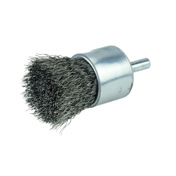 Weiler 1" Coated Cup Crimped Wire End Brush features a solid end construction and very flexible brushing action. ideal for more demanding light-duty cleaning applications in corners and hard-to-reach areas. 1/4" stem diameter for use on die grinder and right angle die grinders. A solid end construction. Very flexible brushing action. Ideal for more demanding light duty cleaning applications in corners and hard-to-reach areas. For use with die grinder and right angle air die grinder power tools. .