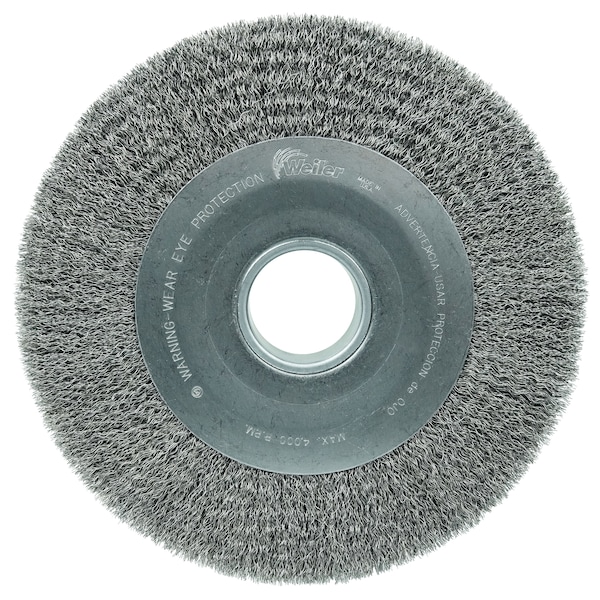 Weiler 10" Wide Face Crimped Wire Wheel provide a flexible brushing action and consistent performance for demanding light-duty cleaning and deburring applications on steel, armored steel, cast iron, ductile iron and tool steel parts. Maximum wire density and aggression and a wider face width to cover more area. 2" arbor hole for use on CNC/milling/automatic machine, bench and pedestal grinders. Provides a flexible brushing action and consistent performance for demanding light duty cleaning and deburring applications. Feature a wider face width to cover more area. Maximum wire density and aggression. Covers more surface area in a single pass. .