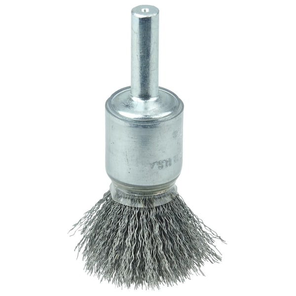 Weiler 1/2" Coated Cup Crimped Wire End Brush features a solid end construction and very flexible brushing action. ideal for more demanding light-duty cleaning applications in corners and hard-to-reach areas. 1/4" stem diameter for use on die grinder and right angle die grinders. A solid end construction. Very flexible brushing action. Ideal for more demanding light duty cleaning applications in corners and hard-to-reach areas. . .