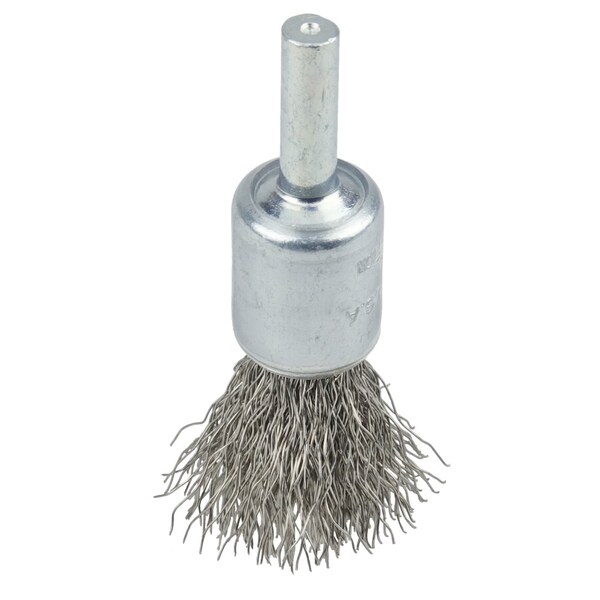 Weiler 1/2" Coated Cup Crimped Wire End Brush features a solid end construction and very flexible brushing action. ideal for more demanding light-duty cleaning applications in corners and hard-to-reach areas. 1/4" stem diameter for use on die grinder and right angle die grinders. A solid end construction. Very flexible brushing action. Ideal for more demanding light duty cleaning applications in corners and hard-to-reach areas. . .