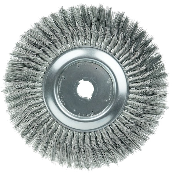 Weiler 12" Standard Twist Knot Wire Wheel Brush provides a heavy-duty brushing action with some flexibility for demanding deburring cleaning and surface preparation applications on somewhat irregular surfaces. Featuring Weiler's individual knot hole construction, these radial brushes are available in heat-treated steel, type 302 stainless steel and bronze wire for use in a wide variety of applications. 1-1/4" arbor hole for use on bench/pedestal grinder, die grinder, right angle die grinder and straight grinders. Provide heavy duty brushing action with some flexibility. Ideal for demanding cleaning applications on somewhat irregular surfaces. Knot wire wheels with an arbor hole are intended for use on straight grinders and stationary machines such as bench or pedestal grinders and buffing lathes. Featuring Weiler's individual knot hole construction, these radial brushes are available in heat-treated steel, type 302 stainless steel and bronze wire for use in a wide variety of applications. .