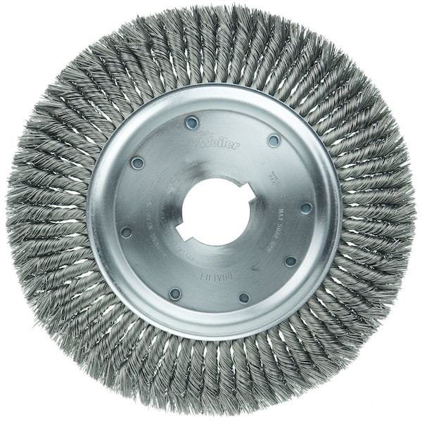 Weiler 12" Standard Twist Knot Wire Wheel Brush provides a heavy-duty brushing action with some flexibility for demanding deburring cleaning and surface preparation applications on somewhat irregular surfaces. Featuring Weiler's individual knot hole construction, these radial brushes are available in heat-treated steel, type 302 stainless steel and bronze wire for use in a wide variety of applications. 2" arbor hole for use on bench/pedestal grinder, die grinder, right angle die grinder and straight grinders. Provide heavy duty brushing action with some flexibility. Ideal for demanding cleaning applications on somewhat irregular surfaces. 13/16 in T at face plate. . .