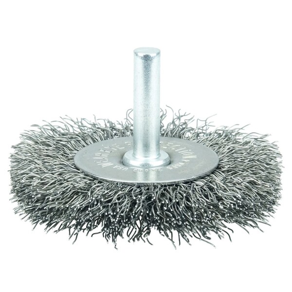 Weiler 2-1/2" Stem-Mounted Crimped Wire Radial Wheel provides a flexible brushing action and consistent performance for demanding light-duty cleaning and deburring applications on steel. Side plates for a shorter trim length and more controlled brushing action. The permanently-attached 1/4 in stem are primarily intended for use on high speed die grinders. Although they can also be mounted onto a drill, the speed and power of that tool will decrease effectiveness of the brush. Featuring Weiler's solid ring construction, these radial wheels are available in heat-treated steel, type 302 stainless steel and brass wire. Side plates for a shorter trim length and more controlled brushing action in a stem-mounted crimped wire wheel. Crimped wire wheels with a permanently-attached 1/4 in stem or shank are primarily intended for use on high speed die grinders. Although they can also be mounted onto a drill, the speed and power of that tool will light weight the effectiveness of the brush. Featuring Weiler's solid ring construction, these radial wheels are available in heat-treated steel, type 302 stainless steel and brass wire. .