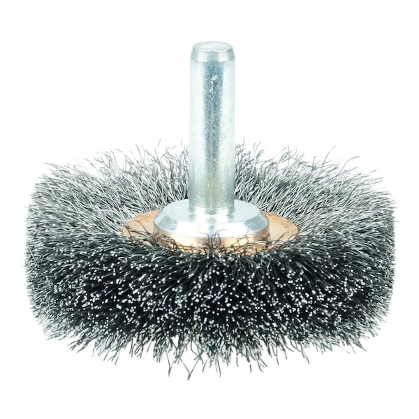Weiler 2-1/2" Narrow Face Stem-Mounted Crimped Wire Wheel provides a flexible brushing action for cleaning and deburring applications on Steel. The permanently-attached 1/4 in stem are intended for use on CNC,/Milling/Automatic Machines, Die Grinders, Drills, Drill Presses, Right Angle Die Grinders and Straight Grinders. Although they can also be mounted onto a drill, the speed and power of that tool will decrease the effectiveness of the brush. Featuring Weiler's solid ring construction, these radial wheels are available in heat-treated steel, type 302 stainless steel and brass wire. Provide a Very Flexible Brushing Action. Crimped wire wheels with a permanently-attached 1/4 in stem or shank are primarily intended for use on high speed die grinders. Although they can also be mounted onto a drill, the speed and power of that tool will light weight the effectiveness of the brush. Featuring Weiler's solid ring construction, these radial wheels are available in heat-treated steel, type 302 stainless steel and brass wire. .