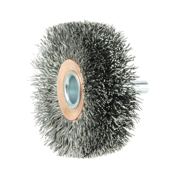 Weiler 2-1/2" Wide Face Stem-Mounted Crimped Wire Wheel provides a flexible brushing action and consistent performance for demanding light-duty cleaning and deburring applications on Steel. The permanently-attached 1/4 in stem are intended for use on CNC,/Milling/Automatic Machines, Die Grinders, Drills, Drill Presses, Right Angle Die Grinders and Straight Grinders. Although they can also be mounted onto a drill, the speed and power of that tool will decrease the effectiveness of the brush. Featuring Weiler's solid ring construction, these radial wheels are available in heat-treated steel, type 302 stainless steel and brass wire. Provides a flexible brushing action and consistent performance for demanding light duty cleaning and deburring applications. Crimped wire wheels with a permanently-attached 1/4 in stem or shank are primarily intended for use on high speed die grinders. Although they can also be mounted onto a drill, the speed and power of that tool will light weight the effectiveness of the brush. Featuring Weiler's solid ring construction, these radial wheels are available in heat-treated steel, type 302 stainless steel and brass wire. .