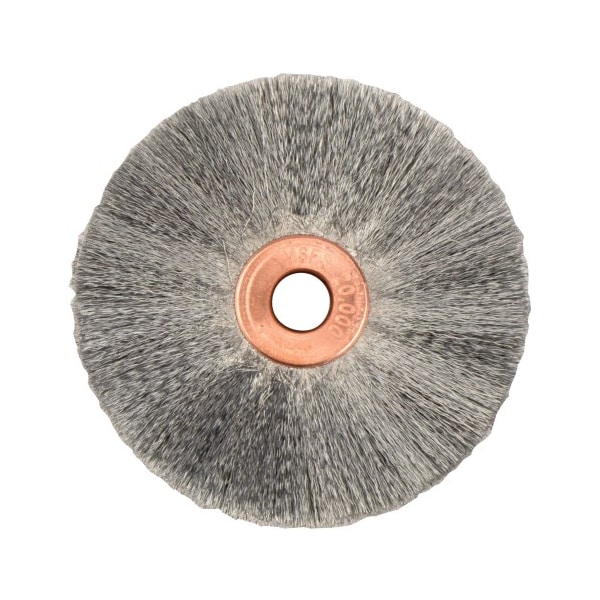 Weiler 2" Small Diameter Crimped Wire Wheel Brush provides a flexible brushing action and consistent performance for demanding light duty cleaning and deburring applications. Featuring Weiler's solid ring construction, these radial brushes are available in heat-treated steel, type 302 stainless steel and brass wire for use in a wide variety of applications. 1/4" arbor hole for use on die grinder, right angle die grinder and drills. Provides a flexible brushing action and consistent performance for demanding light duty cleaning and deburring applications. For use on straight grinders and stationary machines such as bench or pedestal grinders and buffing lathes. Weiler's small diameter crimped wire wheels feature a plain arbor hole for use on a variety of portable tools and stationary machines. Featuring Weiler's solid ring construction, these radial brushes are available in heat-treated steel, type 302 stainless steel and brass wire for use in a wide variety of applications. .