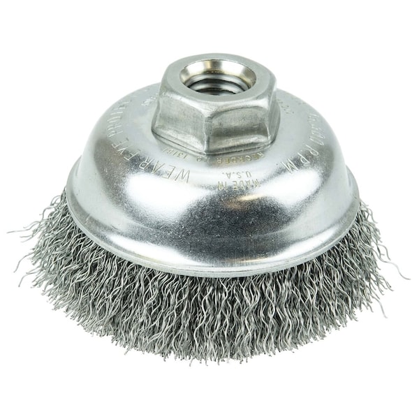 Weiler 3-1/2" Crimped Wire Cup Brush provides very flexible brushing action and the most consistent performance for demanding light to medium duty cleaning applications on relatively flat surfaces. 5/8"-11 nut for use on right angle grinders. For Light to Medium Duty, General Purpose Applications. . . . .