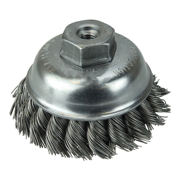 Weiler 3-1/2" Single Row Knot Wire Cup Brush provides heavy-duty brushing action with some flexibility; ideal for demanding cleaning applications on relatively flat surfaces. M10x1.50 nut for use on right angle grinder. Provide heavy duty brushing action with some flexibility. Ideal for demanding cleaning applications on relatively flat surfaces. . Suitable for right angle grinder tool usage. .