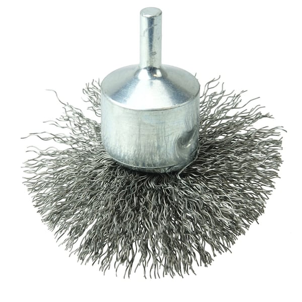 Weiler 3" Circular Flared Crimped Wire End Brush features wire fill which has been "pre-flared" to match the working angle of the brush at operating speed and suited for addressing broad and slightly contoured surfaces on steel parts. 1/4" stem diameter for use on die grinder, drill, drill press and right angle air die grinder. Crimped wire fill which has been "pre-flared" to match the working angle of the brush at operating speed. Suited for addressing broad and slightly contoured surfaces. For use with die grinder and right angle air die grinder power tools. . .
