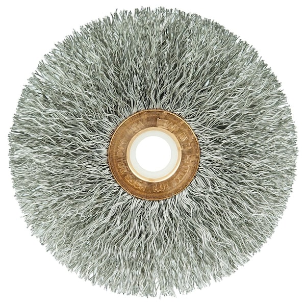 Weiler 3" Small Diameter Crimped Wire Wheel Brush provides a flexible brushing action and consistent performance for demanding light duty cleaning and deburring applications. Featuring Weiler's solid ring construction, these radial brushes are available in heat-treated steel, type 302 stainless steel and brass wire for use in a wide variety of applications. 1/2"-3/8" arbor hole for use on die grinder, right angle die grinder and drills. Provides a flexible brushing action and consistent performance for demanding light duty cleaning and deburring applications. For use on straight grinders and stationary machines such as bench or pedestal grinders and buffing lathes. Weiler's small diameter crimped wire wheels feature a plain arbor hole for use on a variety of portable tools and stationary machines. Featuring Weiler's solid ring construction, these radial brushes are available in heat-treated steel, type 302 stainless steel and brass wire for use in a wide variety of applications. .