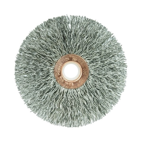 Weiler 3" Small Diameter Crimped Wire Wheel Brush provides a flexible brushing action and consistent performance for demanding light duty cleaning and deburring applications. Featuring Weiler's solid ring construction, these radial brushes are available in heat-treated steel, type 302 stainless steel and brass wire for use in a wide variety of applications. 1/2"-3/8" arbor hole for use on die grinder, right angle die grinder and drills. Provides a flexible brushing action and consistent performance for demanding light duty cleaning and deburring applications. For use on straight grinders and stationary machines such as bench or pedestal grinders and buffing lathes. Weiler's small diameter crimped wire wheels feature a plain arbor hole for use on a variety of portable tools and stationary machines. Featuring Weiler's solid ring construction, these radial brushes are available in heat-treated steel, type 302 stainless steel and brass wire for use in a wide variety of applications. .