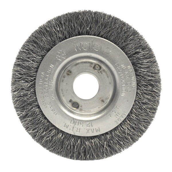 Weiler 3" Narrow Face Crimped Wire Wheel Brush provides a flexible brushing action and consistent performance for demanding light duty cleaning and deburring applications. Featuring Weiler's solid ring construction, these radial brushes are available in heat-treated steel, type 302 stainless steel and brass wire for use in a wide variety of applications. 1/2"-3/8" arbor hole for use on bench/pedestal grinder, CNC/milling/automatic machines and straight grinders. Intended for use on straight grinders and stationary machines such as bench or pedestal grinders and buffing lathes. Featuring Weiler's solid ring construction, these radial brushes are available in heat treated steel, type 302 stainless steel and brass wire for use in a wide variety of applications. Provides a flexible brushing action and consistent performance for demanding light duty cleaning and deburring applications. 7/16 in T at face plate. .