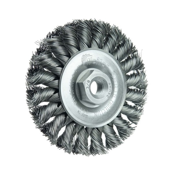 Weiler 3" Standard Twist Knot Wire Wheel Brush provides a heavy-duty brushing action with some flexibility for demanding deburring cleaning and surface preparation applications on somewhat irregular surfaces. Featuring Weiler's individual knot hole construction, these radial brushes are available in heat-treated steel, type 302 stainless steel and bronze wire for use in a wide variety of applications. 3/8"-24 nut for use on right angle grinders. Provide heavy duty brushing action with some flexibility. Ideal for demanding cleaning applications on somewhat irregular surfaces. 7/16 in T at face plate. . .
