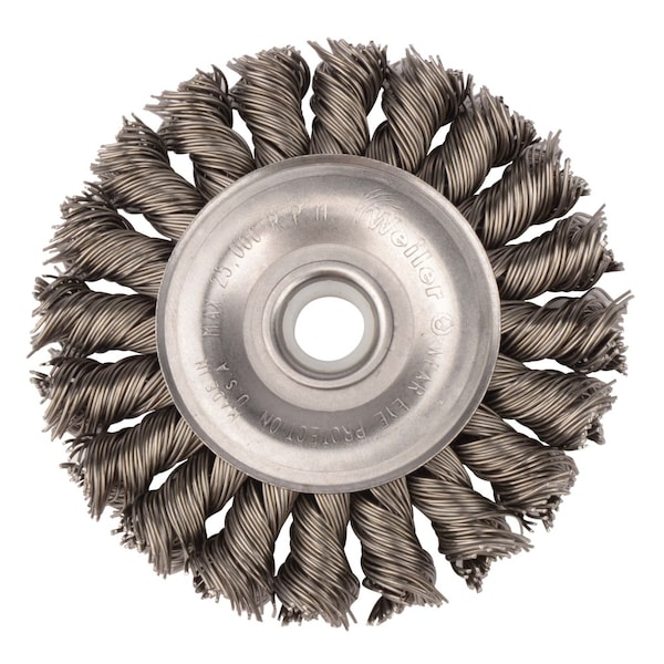 Weiler 3" Standard Twist Knot Wire Wheel Brush provides a heavy-duty brushing action with some flexibility for demanding deburring cleaning and surface preparation applications on somewhat irregular surfaces. Featuring Weiler's individual knot hole construction, these radial brushes are available in heat-treated steel, type 302 stainless steel and bronze wire for use in a wide variety of applications. 1/2"-3/8" arbor hole for use on bench/pedestal grinder, die grinder, right angle die grinder and straight grinders. Provide heavy-duty brushing action with some flexibility. Ideal for demanding cleaning applications on somewhat irregular surfaces. . . .