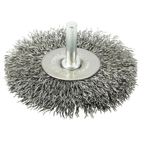 Weiler 3" Stem-Mounted Crimped Wire Radial Wheel provides a flexible brushing action and consistent performance for demanding light-duty cleaning and deburring applications on steel. Side plates for a shorter trim length and more controlled brushing action. The permanently-attached 1/4 in stem are primarily intended for use on high speed die grinders. Although they can also be mounted onto a drill, the speed and power of that tool will decrease effectiveness of the brush. Featuring Weiler's solid ring construction, these radial wheels are available in heat-treated steel, type 302 stainless steel and brass wire. Side plates for a shorter trim length and more controlled brushing action in a stem-mounted crimped wire wheel. Crimped wire wheels with a permanently-attached 1/4 in stem or shank are primarily intended for use on high speed die grinders. Although they can also be mounted onto a drill, the speed and power of that tool will light weight the effectiveness of the brush. Featuring Weiler's solid ring construction, these radial wheels are available in heat-treated steel, type 302 stainless steel and brass wire. .
