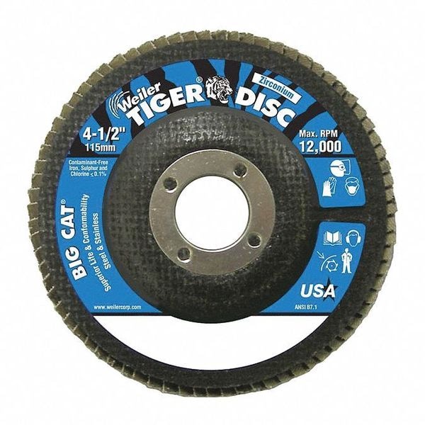 Flap Disc, Abrasive Type Coated, Abrasive Material Zirconia Alumina, Grade Medium, Backing Plate Material Phenolic, Connector Size 5/8 In.-11, Connector Type Threaded Hole, Density Rating High, Flap Disc Type Type 27, Overall Diameter 4 1/2 in, Series Tiger Big Cat HD, Backing Material Phenolic, Grit 60, Maximum Operating Speed 12,000 RPM, Color Blue