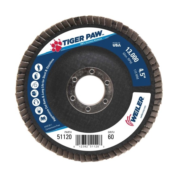 If you need maximum aggression for sustained stock removal, you need Tiger Paw flap discs. High performance 100% zirconia alumina grain ideal for heavy duty applications on steel and stainless steel. Designed for the user looking for aggressive performance and long life in heavy duty applications like edge grinding. . . .