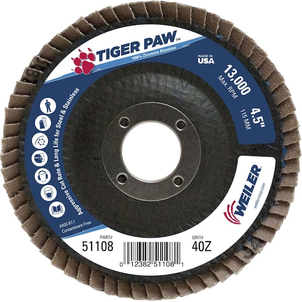 Tiger Paw 4.5 inch flat flap discs are designed for demanding metalworking applications like edge grinding on steel and stainless steel. Tiger Paw leverages 100% zirconia alumina grain that holds up under high temperatures and extreme pressure delivering high performance on heavy duty applications.