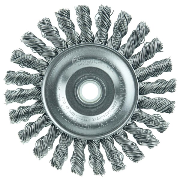 Weiler 4" Cable Twist Knot Wire Wheel Brush provides maximum brushing action with minimal flexibility. Ideal for demanding cleaning and coating removal applications on relatively smooth surfaces. 1/2"-3/8" arbor hole for use on right angle grinders. provide maximum brushing action with minimal flexibility;ideal for demanding cleaning and coating removal applications on relatively smooth surfaces. . . . .