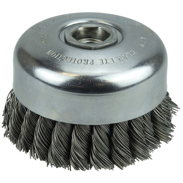 Weiler 4" Double Row Knot Wire Cup Brush features an nternal nut for use on dedicated equipment such as line traveling machines that clean and prep the O.D. of pipe prior to coating. 5/8"-11 nut for use on right angle grinders. Internal nut for use on dedicated equipment such as line traveling machines that clean and prep OD of pipe prior to coating. Suitable for right angle grinder. . . .