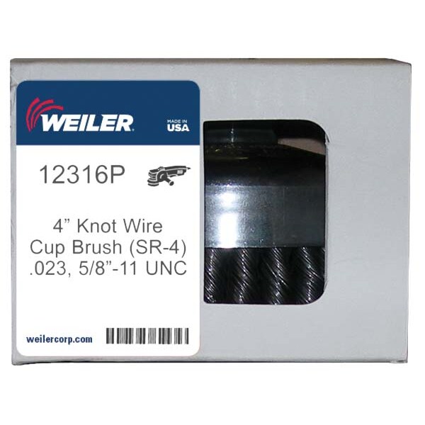 Weiler 4" Single Row Knot Wire Cup Brush provides heavy-duty brushing action with some flexibility for demanding cleaning applications on relatively flat surfaces. 5/8"-11 nut for use on right angle grinders. This product is clamshell packed for retail sale. Provide heavy duty brushing action with some flexibility. Ideal for demanding cleaning applications on relatively flat surfaces. . . .