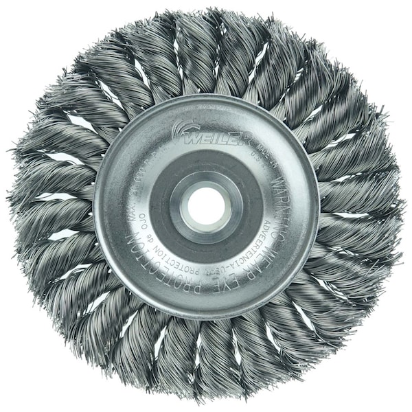 Weiler 4" Standard Twist Knot Wire Wheel Brush provides a heavy-duty brushing action with some flexibility for demanding deburring cleaning and surface preparation applications on somewhat irregular surfaces. Featuring Weiler's individual knot hole construction, these radial brushes are available in heat-treated steel, type 302 stainless steel and bronze wire for use in a wide variety of applications. 1/2"-3/8" arbor hole for use on bench/pedestal grinder, die grinder, right angle die grinder and straight grinders. Knot wire wheels with an arbor hole are intended for use on straight grinders and stationary machines such as bench or pedestal grinders and buffing lathes. Featuring Weiler's individual knot hole construction, these radial brushes are available in heat treated steel, type 302 stainless steel and bronze wire for use in a wide variety of applications. 7/16 in T of face plate. Tool: bench grinder, pedestal grinder and straight grinder. Provide heavy-duty brushing action with some flexibility.