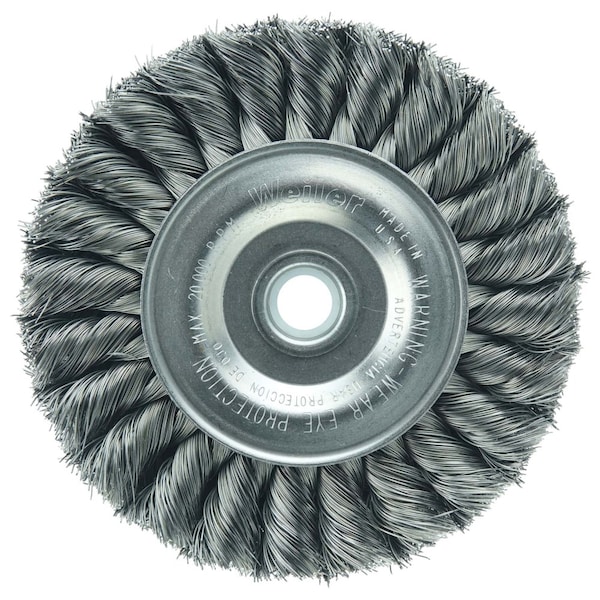 Weiler 4" Standard Twist Knot Wire Wheel Brush provides a heavy-duty brushing action with some flexibility for demanding deburring cleaning and surface preparation applications on somewhat irregular surfaces. Featuring Weiler's individual knot hole construction, these radial brushes are available in heat-treated steel, type 302 stainless steel and bronze wire for use in a wide variety of applications. 1/2"-3/8" arbor hole for use on bench/pedestal grinder, die grinder, right angle die grinder and straight grinders. Provide heavy duty brushing action with some flexibility. Double row of knotted wire for a wider brush face. Knot wire wheels with an arbor hole are intended for use on straight grinders and stationary machines such as bench or pedestal grinders and buffing lathes. Featuring Weiler's individual knot hole construction, these radial brushes are available in heat-treated steel, type 302 stainless steel and bronze wire for use in a wide variety of applications. Ideal for demanding cleaning applications on somewhat irregular surfaces.