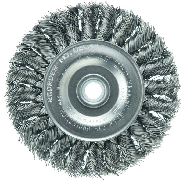 Weiler 4" Standard Twist Knot Wire Wheel Brush provides a heavy-duty brushing action with some flexibility for demanding deburring cleaning and surface preparation applications on somewhat irregular surfaces. Featuring Weiler's individual knot hole construction, these radial brushes are available in heat-treated steel, type 302 stainless steel and bronze wire for use in a wide variety of applications. 1/2"-3/8" arbor hole for use on bench/pedestal grinder, die grinder, right angle die grinder and straight grinders. Provide heavy-duty brushing action with some flexibility. Ideal for demanding cleaning applications on somewhat irregular surfaces. . . .