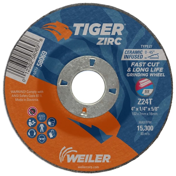 Tiger Zirc 4 inch type 27 grinding wheels cut faster and last longer so you get proven productivity at an exceptional total cost. The self-sharpening zirconia alumina grains retain a high cut rate throughout the life of the wheel while a hard bond delivers long wheel life for heavy duty applications. The flat profile with depressed center allows for a wide range of grinding angles (0-45°). 1/4" wheel thickness is ideal for heavy stock removal, scale removal, weld removal, weld blending, edge beveling and torch-cut softening with a grinder. The 5/8" open arbor offers a cost-effective mounting option when using adapting nuts.