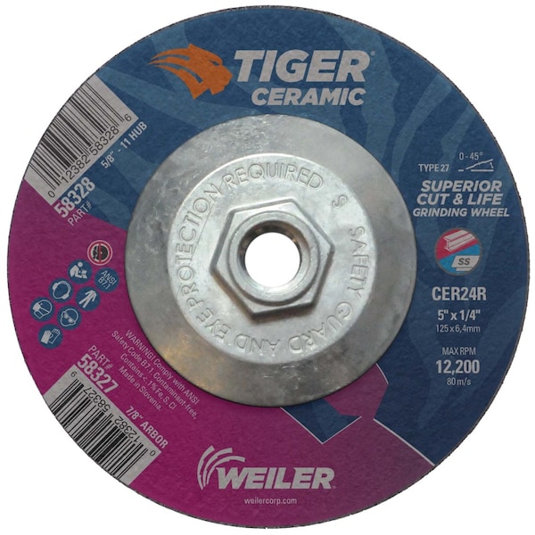 With Tiger Ceramic 5 inch type 27 depressed center grinding wheels, there’s no more compromise when grinding the toughest metals. Now you can maximize your time on the job with a superior combination of life and cut rate for maximum productivity. Self-sharpening and cool cutting, ceramic grains remove material effortlessly while a hard bond keeps working longer. The flat profile of the wheel in combination with depressed center allows for a wide range of grinding angles (0-45).