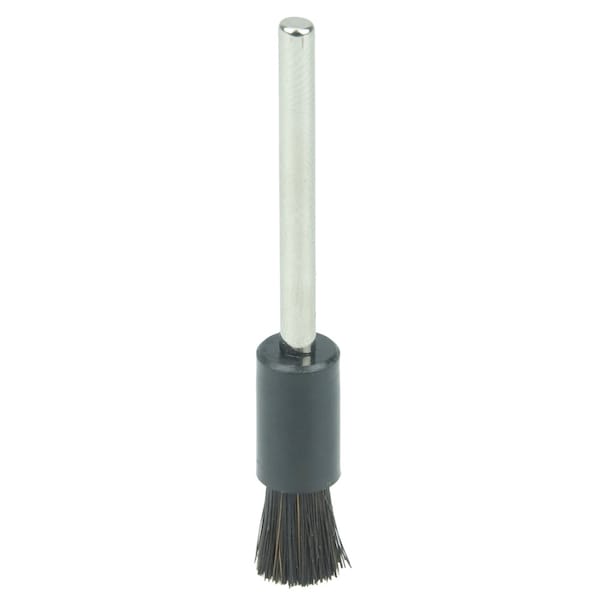 Weiler 5/16" Miniature Stiff Hair End Brush contains natural hair fill for scratch-free cleaning of small parts or for buffing and polishing features such as slots and groves using abrasive compounds. 1/8" stem for use on flexible shaft tool and high speed pencil grinders. Plastic ferrule cup to protect internal surfaces during use. . . . .