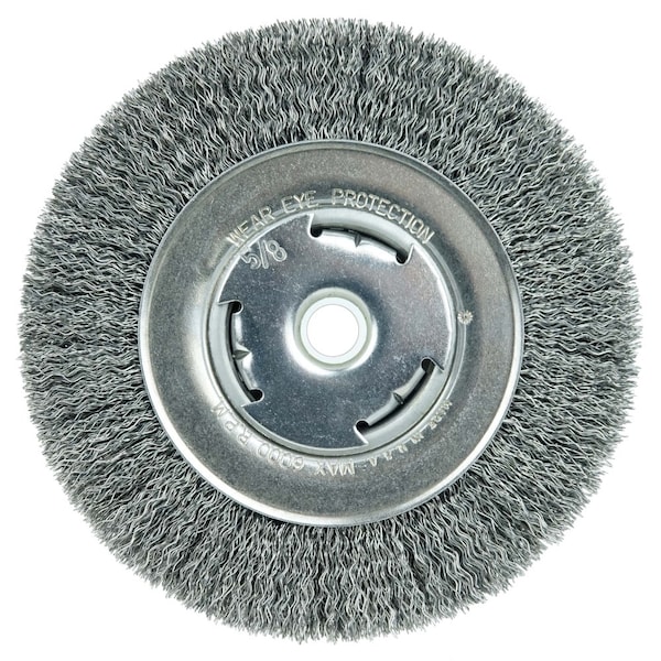 Wolverine 6" Wide Face Crimped Wire Bench Grinder Wheel provides a flexible brushing action and consistent performance for demanding light-duty cleaning and deburring applications on steel, armored steel, cast iron, ductile iron and tool steel parts. Features a wider face width to cover more surface area. 5/8"-1/2" arbor hole for use on CNC/milling/automatic machine, bench, pedestal and straight grinders. Provides a flexible brushing action and consistent performance for demanding light duty cleaning and deburring applications. Feature a wider face width to cover more area. Covers more surface area in a single pass. . .